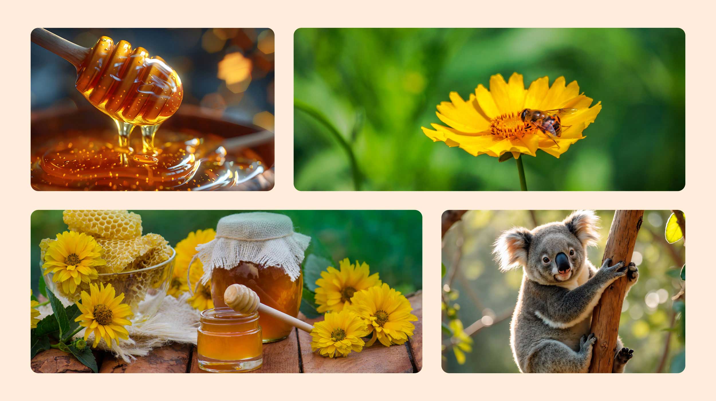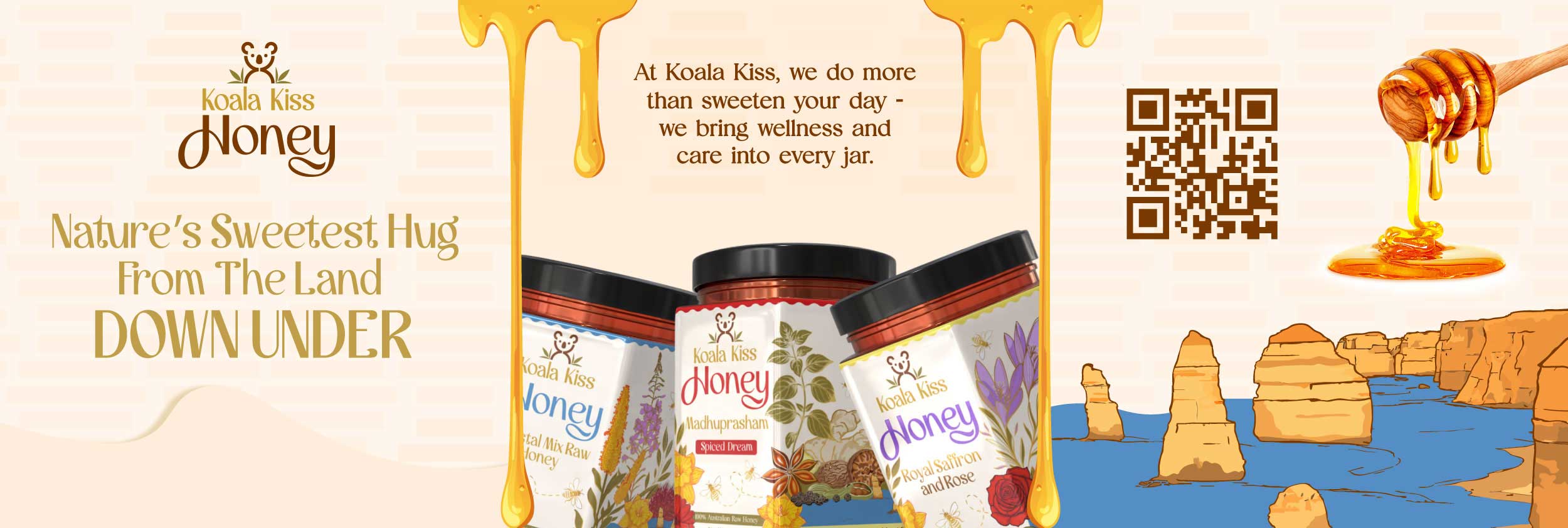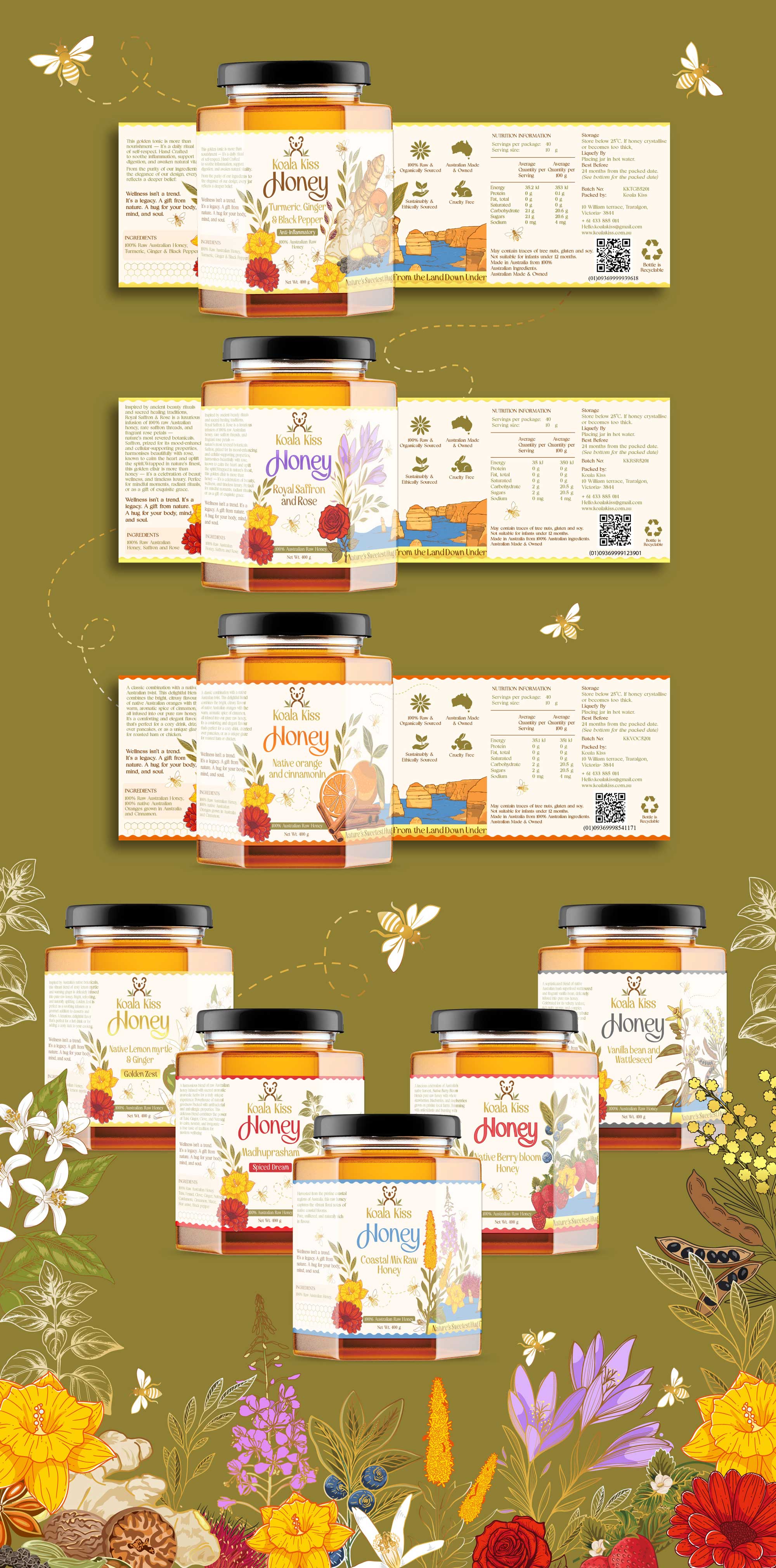Nature’s Sweetest Hug From the Land Down Under Koala Kiss Honey is more than honey — it’s a daily ritual of warmth, comfort, and natural nourishment. Handcrafted in small batches using pure Australian honey infused with botanicals like turmeric, ginger, saffron, and rose, each blend is made to soothe the mind, body, and spirit. Rooted in Ayurvedic wisdom and inspired by Australia’s wild beauty, our honey invites you to slow down, breathe, and savour a moment just for yourself. Crafted with care. Infused with purpose. Shared with love.